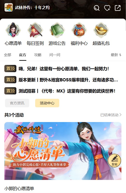 二十年弹指一挥间,咱们郭女侠终于“毕业了”!当年以“雌雄双侠”出道的大小姐,如今在时光的摩挲中体验了江湖百态,但藏在他侠女外表下的少女心愿,可一点没少!快来解锁这份《小郭的心愿清单》,一起帮她把江湖遗憾全清零! 1月23日10:00至1月29日23:59 活动期间前往官方社区专区首页点击“心愿清单”参与活动,或点击首页“活动中心”找到活动点击进入,点击心愿清单,选择对应心愿赞助即可!完成赞助可获得一次抽奖机会,想要更多抽奖机会,可以通过邀请好友前来参与哦!玩法详情见活动页面。 抽奖道具奖励将直接发放至游戏内邮箱。“武林外传助手”以CDK形式发放,仅可在39云手机内使用,请前往39云手机内进行兑换; "心愿赞助"结算以活动时间结束时数据为准,若5个心愿均达成,则所有参与赞助的玩家均可获得5个心愿对应道具奖励。若部分心愿完成,则所有参与赞助的玩家均可获得已完成心愿对应的道具奖励。 注:奖励根据活动期间绑定的角色为准进行发放! 部分活动奖励一览 A:1、每日首次登录活动并绑定角色可获得系统赠送的1次赞助机会; 2、当日首次通过他人分享链接进入,则双方均可获得1次赞助机会。同理,邀请他人进入活动,若对方为当日首次通过分享链接进入,则双方均可获得1次赞助次数; 3、被邀请人为39游戏盒子新注册用户时,双方均可获得3次赞助次数; 4、每日获取次数上限为10次,次数溢出时不累加,每日0点清空。 A:1、积极参与赞助活动,并完成赞助,即可获得抽奖次数; 2、每日获取次数上限为10次,每日0点清空。 A:心愿赞助进度条以活动时间结束时为止,由工作人员在7个工作日内进行统一结算。不对单一进度条进行结算,请耐心等待! A:可以!为了保证大家能顺利参与抽奖,在活动时间结束前,当5个心愿赞助均已满,则统一开启赞助按钮,方便大家进行赞助以便转换抽奖次数。
